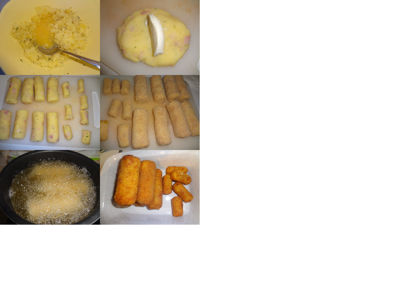 Lessate le patate (anche a vapore se volete), devono essere ben lesse. Sbucciatele e passatele con passapatate. Incorporare sale, pepe, un pizzico di noce moscatta, un cucchiaino di prezzemolo e il grana grattuggiato. Mescolare fino a quando sarà uniforme. Assaggiate se va bene di sale. Aggiungete il prosciutto tagliato a tocchettini piccoli e mescolare ancora. La mozzarella migliore per fare questa ricetta è il "panetto" ma rigorosamente di Fratelli Nobili, che è mozzarella vera al 100% e non pizzotella, o formaggi fusi ecc...(anche la Santa Lucia va bene)! E' meno lattosa della mozzarella tonda perciò sprigiona meno liquido durante la cottura ed andrete bene a tagliarla. Tagliate la mozzarella a fette spesse di circa 1,5 cm o anche poco più. Tagliate poi la fette per la lunghezza di altrettanta misura, creando così delle strisce di mozzarella tipo un dito! Prendete una cucchiaiata di composto, lavoratela un secondo con le mani e mettetela sul piano di lavoro formando un disco. Metteteci al centro una striscia di mozzarella e poi arrotolate dolcemente e chiudete le estremità. Rollate leggermente e lavoratelo con le mani formando del cilindri, cercando di evitare che si veda la mozzarella (dovrebbe trovarsi tutta all'interno). Sbattere le altre due uova con un pizzico di sale, e un cucchiaio di latte (se ce l'avete altrimenti non importa). Passare i cilindri prima nell'uovo e poi nel pangrattato, coprendo tutti i bordi. Quando avete finito ripassateli tutti. Lasciateli in frigo per almeno un'ora. Mettete abbondate olio in una casseruola, quando sarà ben caldo immergetevi alcuni panzarotti e lasciateli cucinare per 5/6 minuti o comunque fino a quando non avranno una bella doratura. Togliere, adagiare su carta assorbente. Servire tiepidi o caldi!