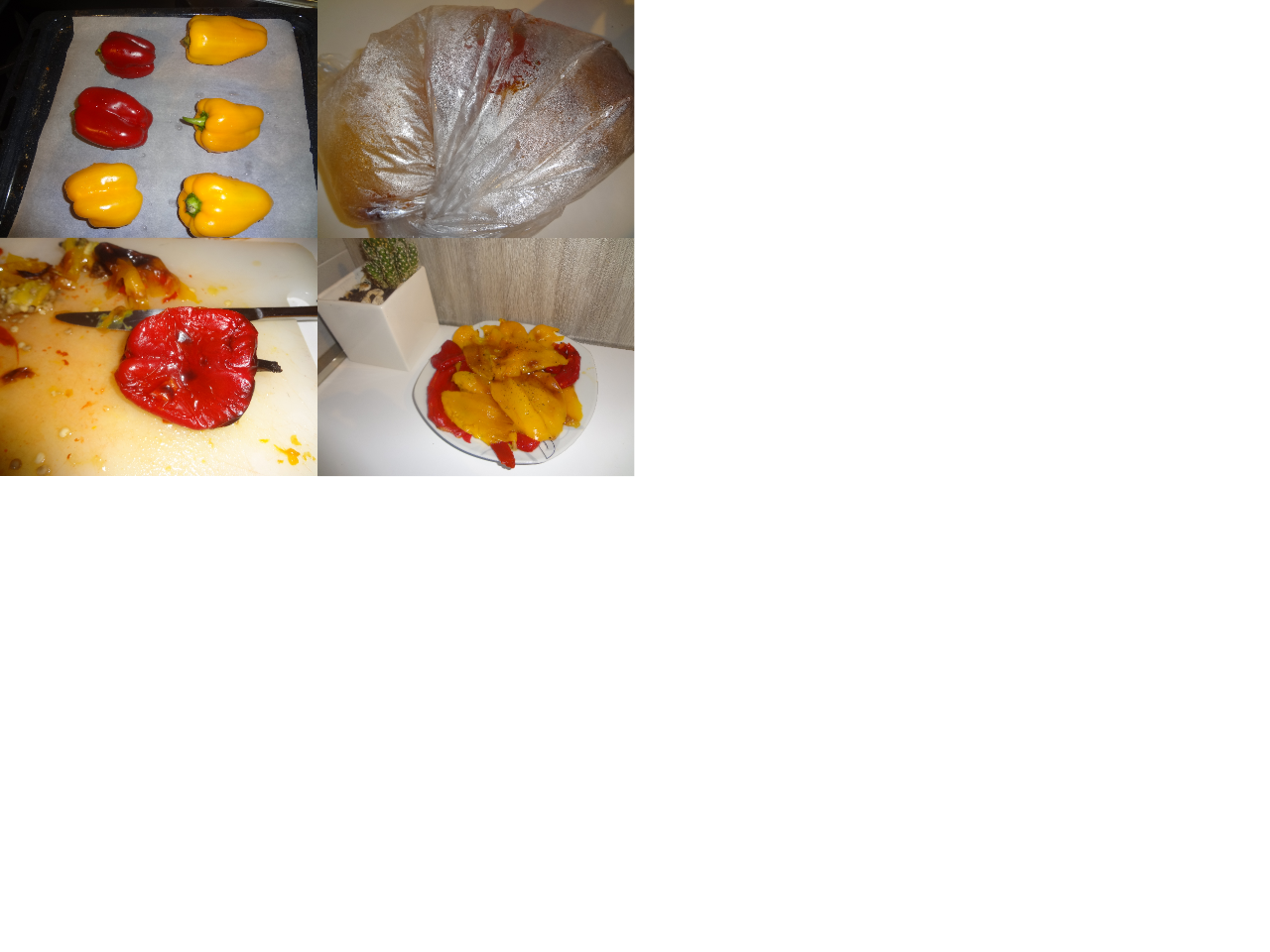 Togliete la teglia dal forno ed inserite i peperoni caldi in un sacchetto gelo che chiuderete. Lasciate raffreddare in questo modo per 20/30 minuti. Quando saranno freddi toglieteli dal saccetto, eliminate il picciolo, aprite i peperoni e togliete la pelle (che si staccherà facilmente) e i semi.
